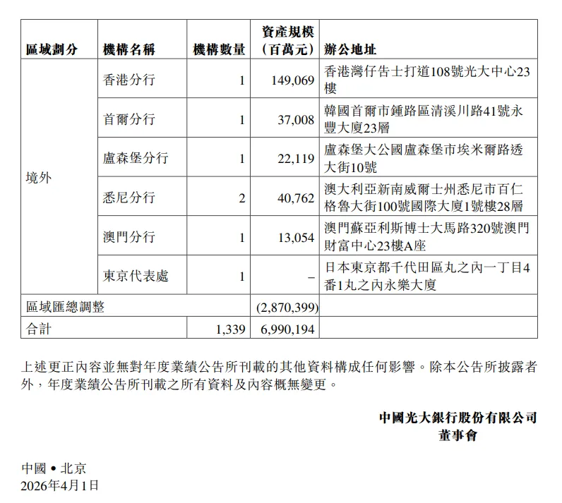 4月1日,光大银行在港交所发布公告,经核查,对该行年度业绩公告中分支机构的资产规模数据进行了确认。光大银行表示,更正内容并无对年度业绩公告所刊载的其他资料构成任何影响。除本公告所披露者外,年度业绩公告所刊载之所有资料及内容概无变更。
