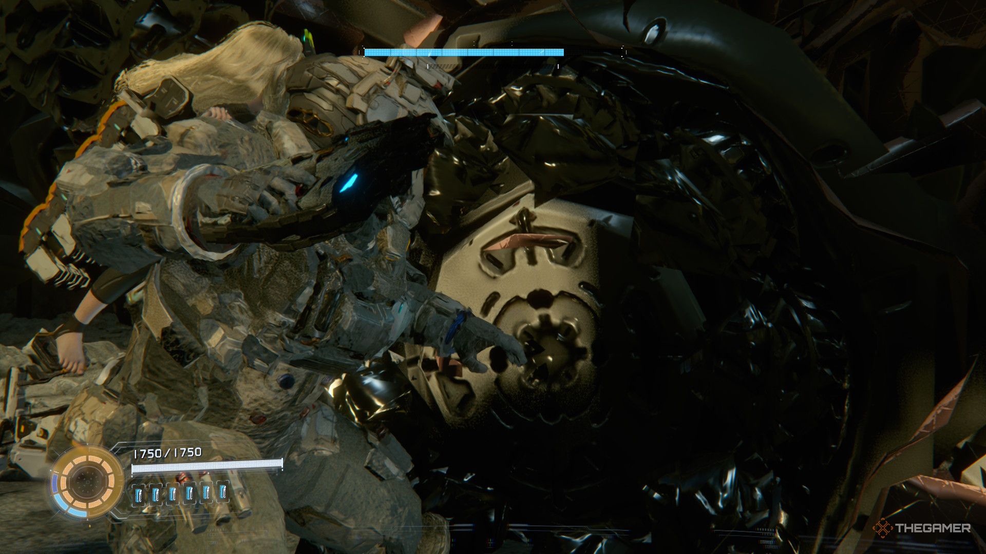 例如,在部署钻头后,它可能会同时发动“口部激光”和“导弹雨”,让你在尝试黑客操作的同时,还要应对多重攻击。这正是该 Boss 战真正的挑战所在。