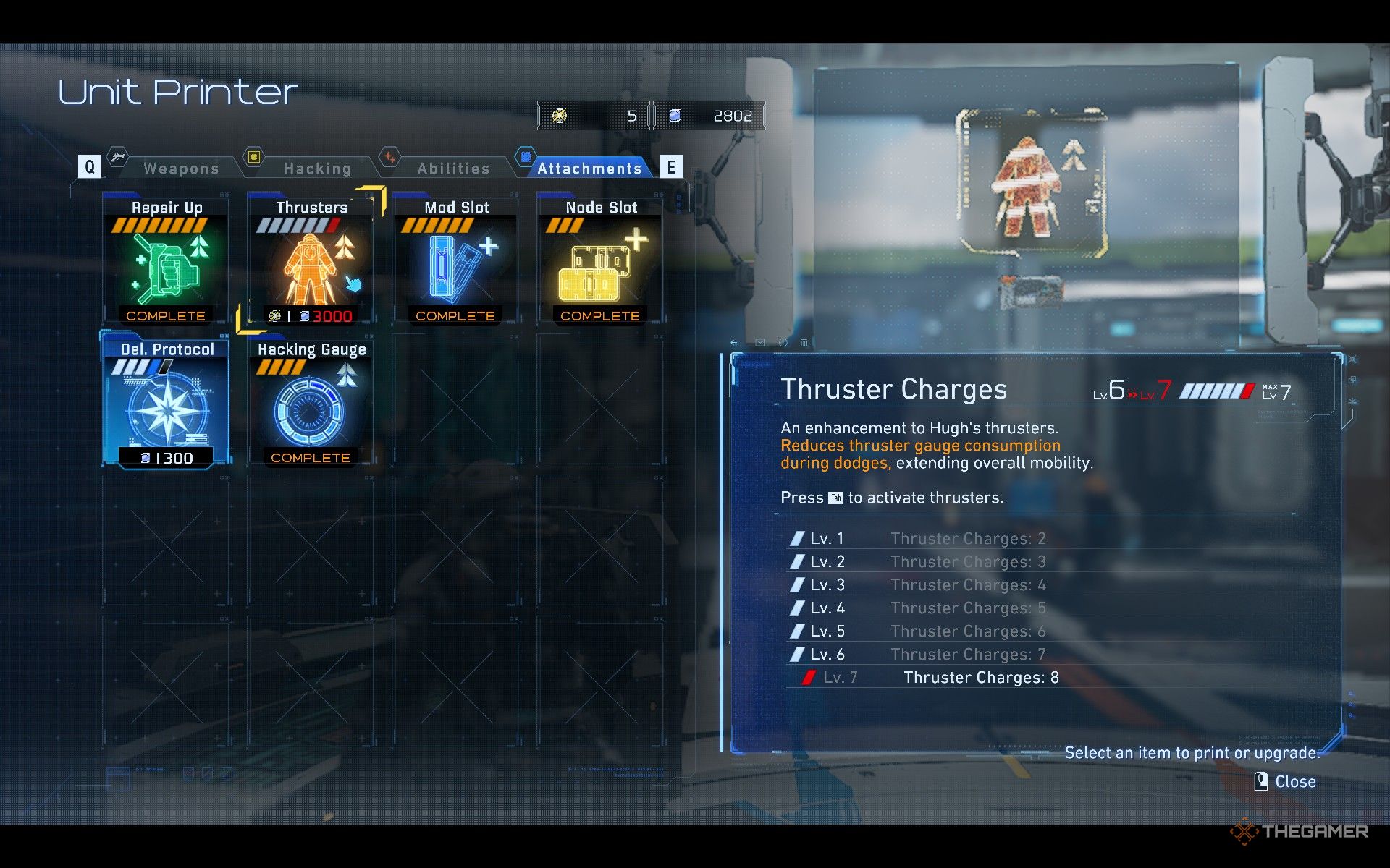 随着你在单元打印机处升级“推进器充能”,Hugh 的靴子将获得额外的推进力,让你移动得更远、更快且更频繁。你可以对推进器充能进行多次升级,所以建议尽早开始并持续强化。