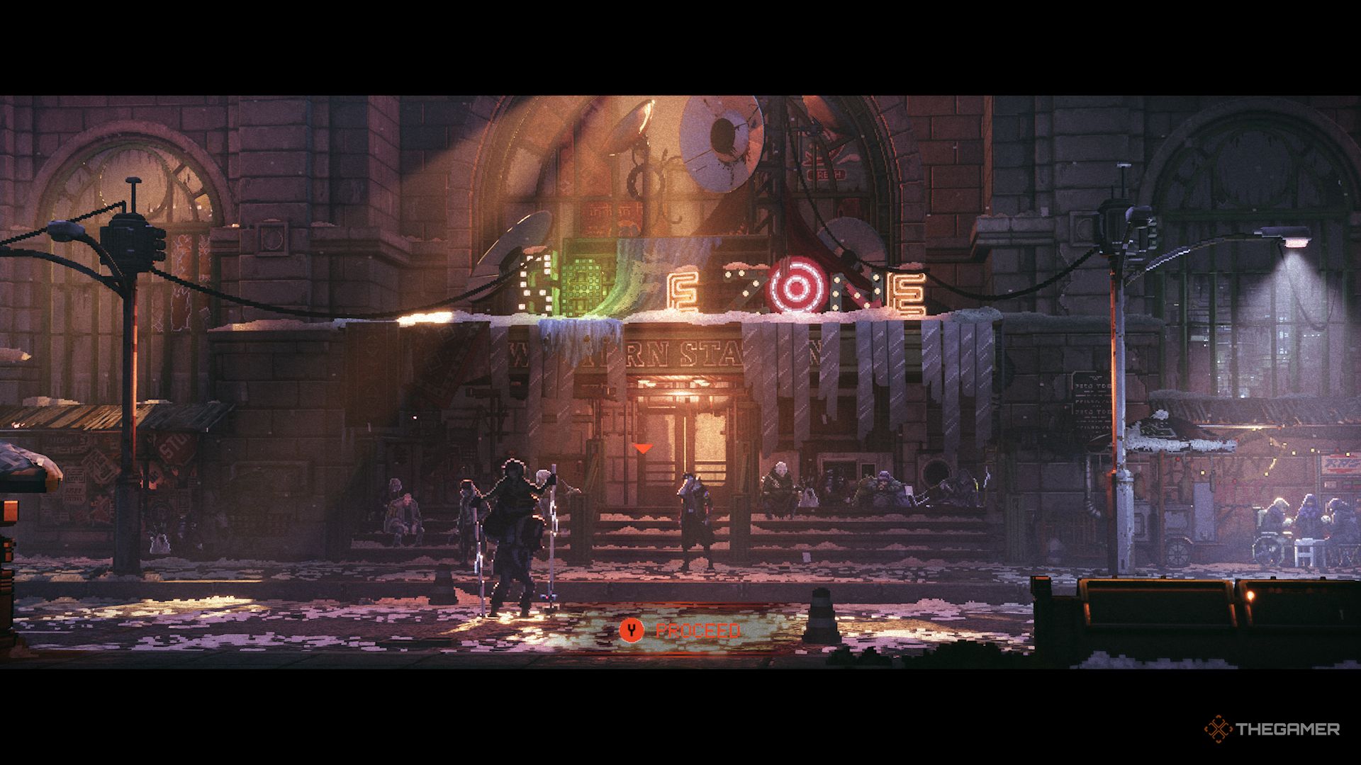 要寻找食物,返回火车站。进入后,向右走并上楼,楼上有一个写着“Food”的巨大霓虹灯牌。这正是你在第二章中遇到议会的地方。