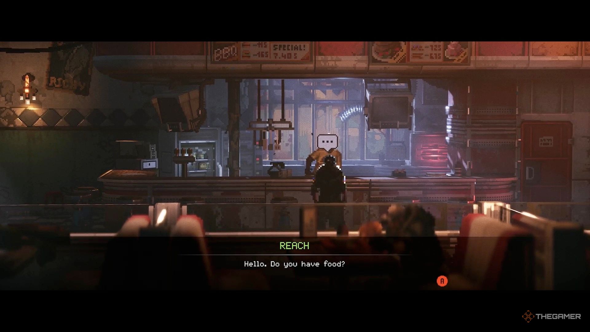 上楼后,与柜台后面的人交谈。他会给你和神剑提供汉堡。把食物带回给狗狗。