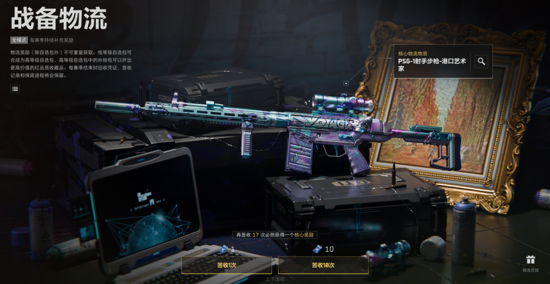 本赛季核心物资为港口艺术家系列!包括PSG-1射手步枪、M249轻机枪、UZI冲锋枪3款武器外观。