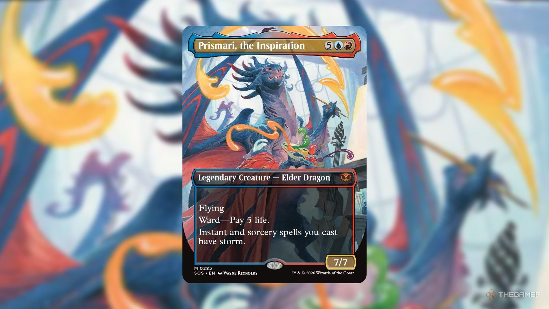 远古龙中的领头羊是 Prismari, The Inspiration,原因只有一个词:风暴(Storm)。这个 7 点法术力的 7/7 传奇生物拥有飞行和 5 点法术力的守卫(ward)。然而,这远不是它最具影响力的方面,因为它还为你施放的所有瞬间和法术咒语赋予了“风暴”。