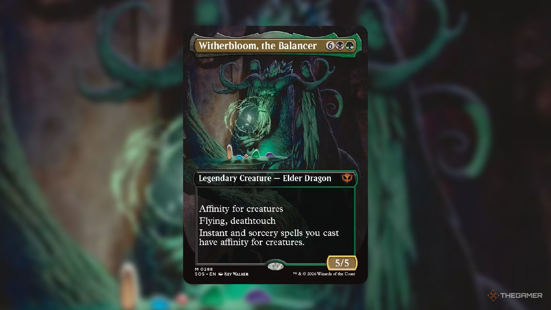 这个 8 点法术力的庞然大物是一个 5/5 飞行、死触的传奇生物,但它拥有“生物亲和(Affinity for creatures)”,意味着你战场上的每个生物都能让它的费用减少 1 点。亲和力只会降低无色法术力费用,这意味着如果你战场上有八个生物,Witherbloom 仍然需要支付一点黑色和一点绿色法术力。尽管如此,你已经消除了施放它所需的额外 6 点法术力。