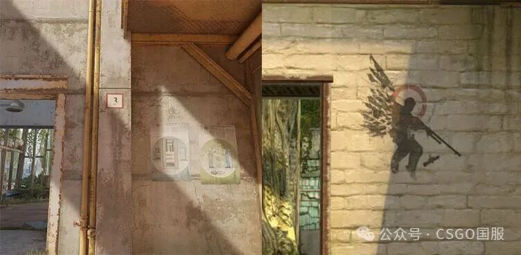 不过当前版本的B区墙上没有s1mple的“盲狙天使”涂鸦。