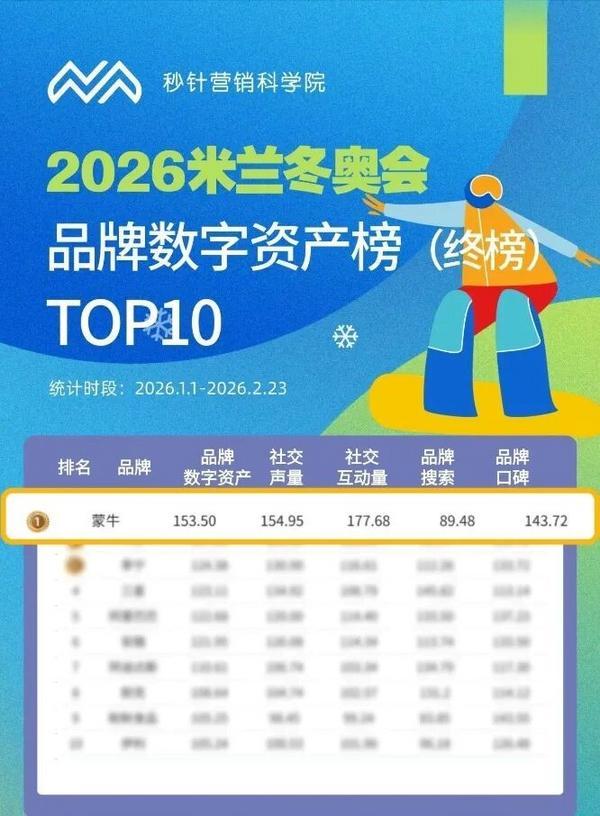 这一长期主义的投入正在被市场验证。在秒针营销研究院发布的《2026米兰冬奥品牌数字资产榜(终榜)》,蒙牛在众多国际品牌中脱颖而出,率先登顶品牌数字资产榜,实现社交声量、互动量、口碑的全面领跑。而且,品牌高曝光也持续带动销售转化,蒙牛业绩在2026年成功迎来“开门红”。