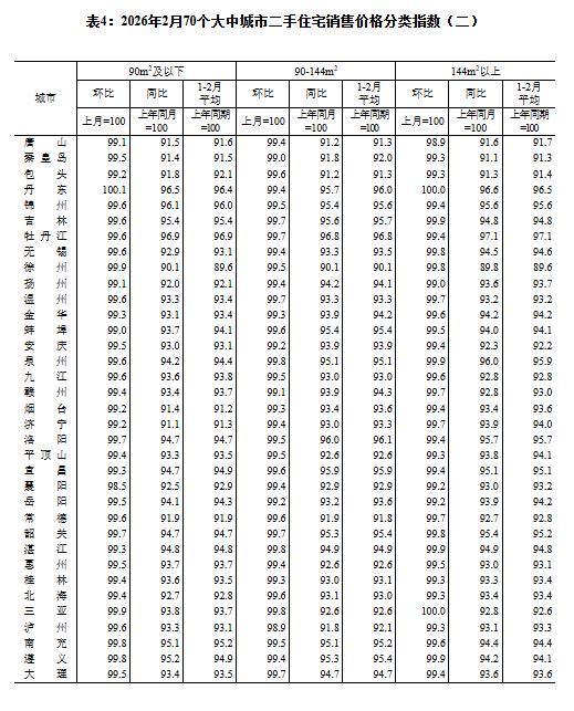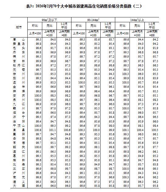 5.按照统计制度规定,2026年1月起,70个大中城市房地产价格统计调查开始使用2025年作为新一轮对比基期,各城市基本分类权数有所调整,以更好反映住宅销售结构变动。经测算,本次基期轮换对70个大中城市商品住宅销售价格各月同比指数影响平均在0.03个百分点以内。