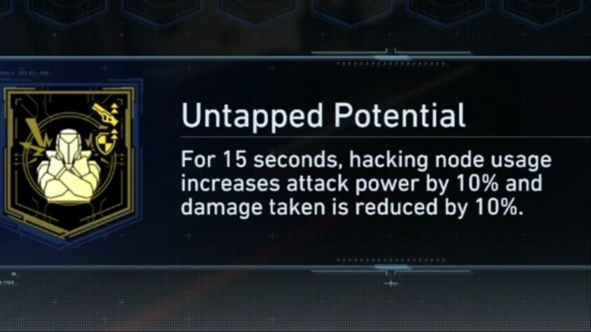接下来是“未开发潜力”,这是一个黑客能力模组。它鼓励你在黑客入侵敌人时多经过黑客节点(Hacking Nodes),因为这能为你提供 10% 的伤害加成,并同时在 15 秒内减少 10% 受到的伤害。没错,该效果可以与“近距离作战”叠加,让你获得总计 20% 的攻击力加成。