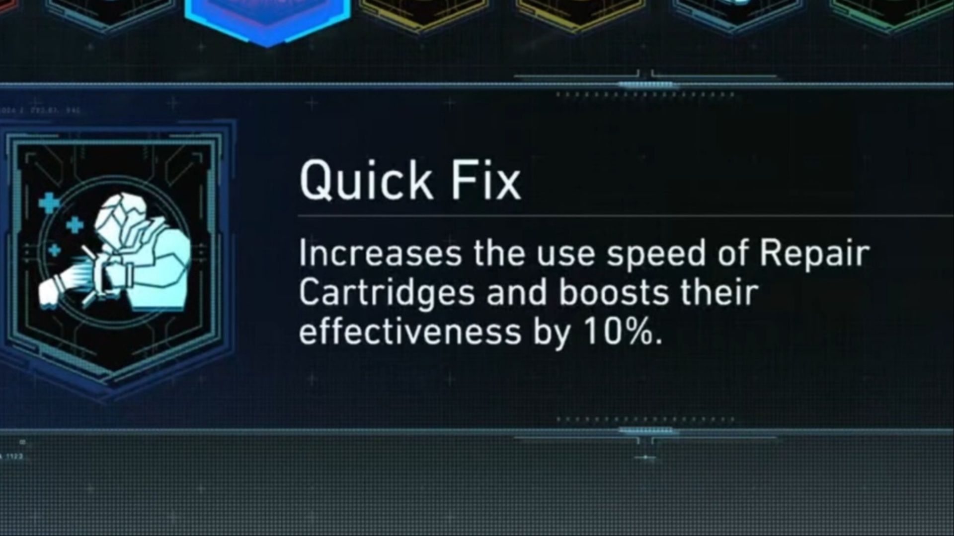 除了进攻型模组,防御类模组也同样出色。“快速修复”能让你在战斗中存活得更久,并节省回复资源,在高难度下尤为关键。该模组能提升 10% 的维修胶囊(Repair Cartridges)回复效果,并缩短使用时间。