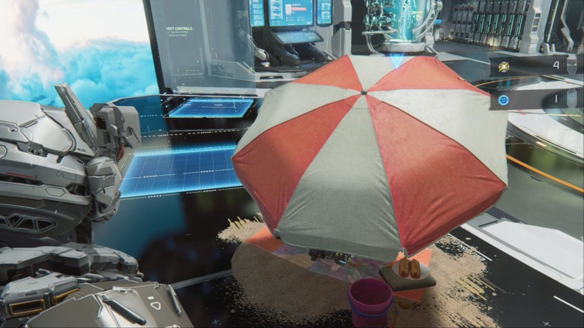 没错,这把遮阳伞上印有 生化危机4:重制版 中 Umbrella Corporation 标志性的红白图案。这是对最优秀生存恐怖游戏之一的微妙但极其出色的致敬。当然,在一个经过消毒的研究设施中看到这个标志可能会让你冒冷汗,但这依然很酷!
