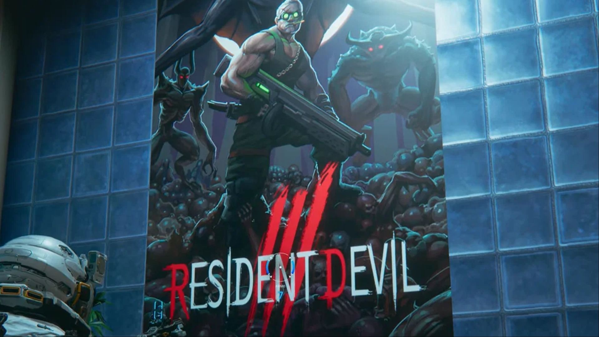 提到海报,接下来的另一张海报同样位于商业区,这次它似乎是 Pragmata 宇宙中的一款游戏,名为“Resident Devil III”。如果你玩过其他 Capcom 作品,会立刻意识到这是对 生化危机4:重制版 和 鬼泣5 系列的致敬,我们必须为此鼓掌。