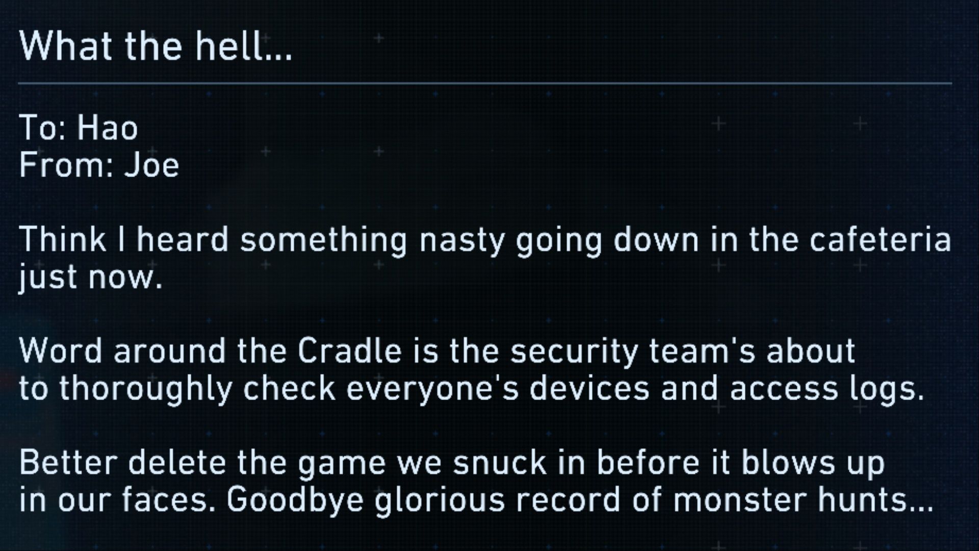 在起重机操作场建筑的二楼找到平板电脑后,你可以阅读一封标题为“搞什么鬼……”的邮件,Hao 在信中解释说安保部门将彻底检查他们的日志和设备,迫使他们删掉偷偷装在设备上的一款游戏。随后 Hao 写道:“再见了,那光荣的怪物狩猎记录……”,这显然是对出色的 Monster Hunter Stories 3: 命运双龙 系列的致敬。即使是在偏僻角落发现的收藏品中,也充满了彩蛋和致敬!