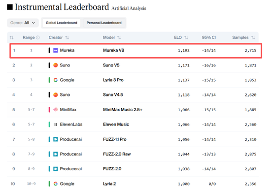Mureka V8发布时在Artificial Analysis Instrumental中的排名表现