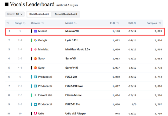Mureka V8发布时在Artificial Analysis Vocals中的排名表现