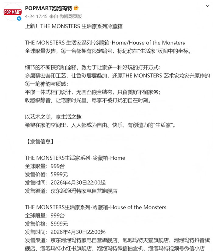 泡泡玛特选择冰箱作为首款家电产品,并非毫无章法。冰箱具有明显的“家居陈列属性”,与潮玩收藏的展示需求天然契合。999台的全球限量,也精准卡位了稀缺性与话题度的平衡点。